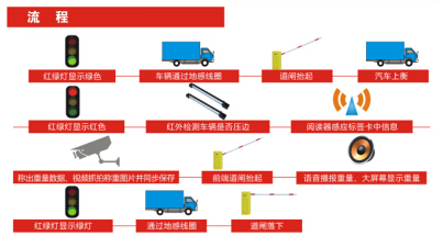流程:紅綠燈顯示綠色——汽車上衡——紅綠燈顯示紅燈——閱讀器感應(yīng)標簽卡中信息——稱出重量數(shù)據(jù)、視頻抓拍稱重圖片并同步保存——道閘抬起——語音播報重量、大屏幕顯示重量——汽車下衡——道閘落下——紅綠燈顯示綠燈